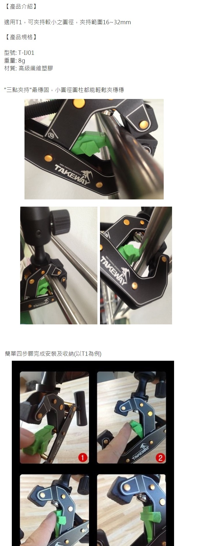 ※此賣場產品內容為T-IJ01內爪*1,不包含賣場介紹內容中的TAKEWAY T1鉗式腳架(需另外購買)以及其他相關拍攝道具等。