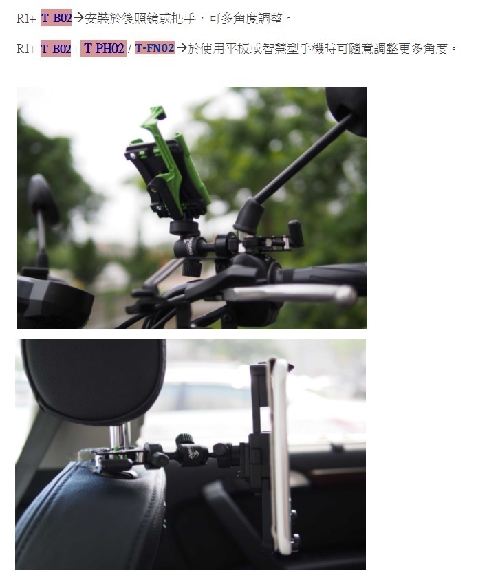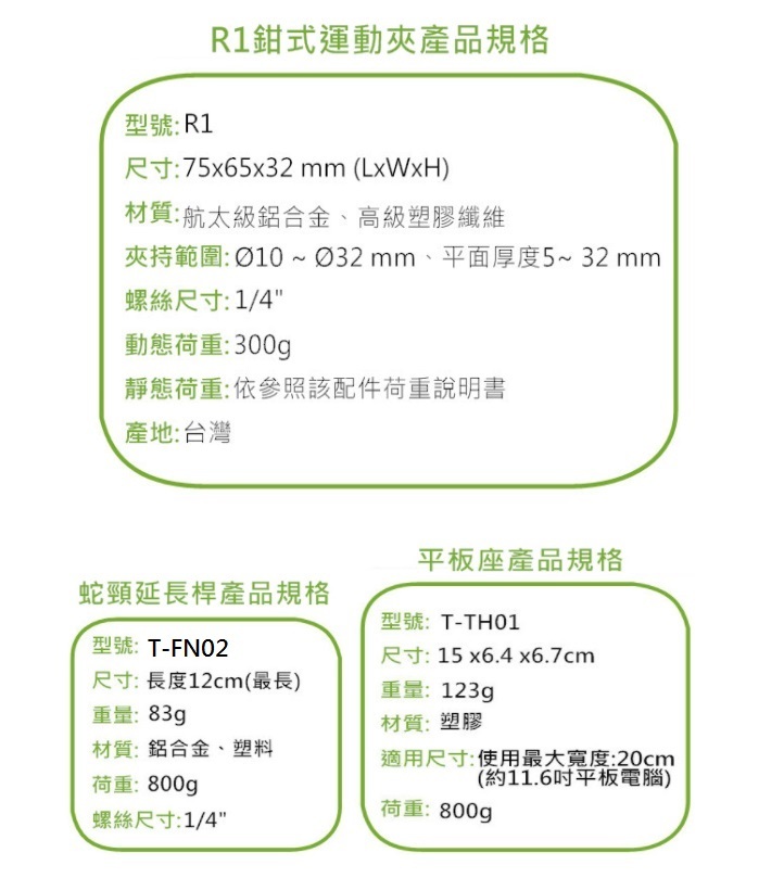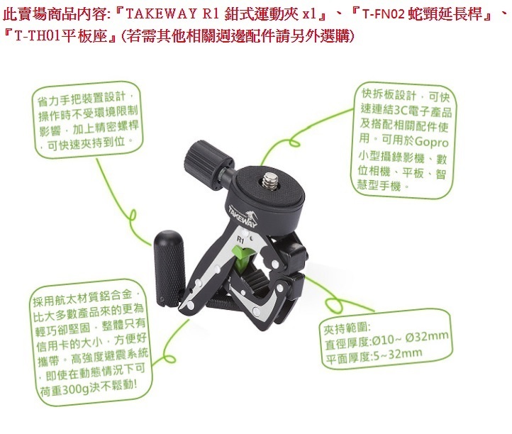 ※此賣場產品內容為R1鉗式運動夾x1、T-FN02蛇頸延長桿x1、T-TH01平板座x1,不包含介紹內容中其相關零配件 ( 請另外選購 )。