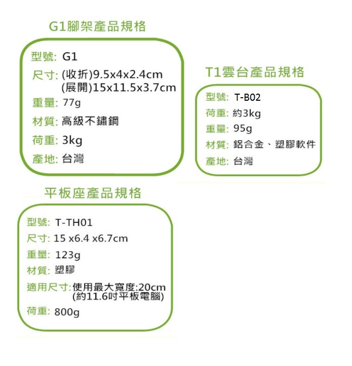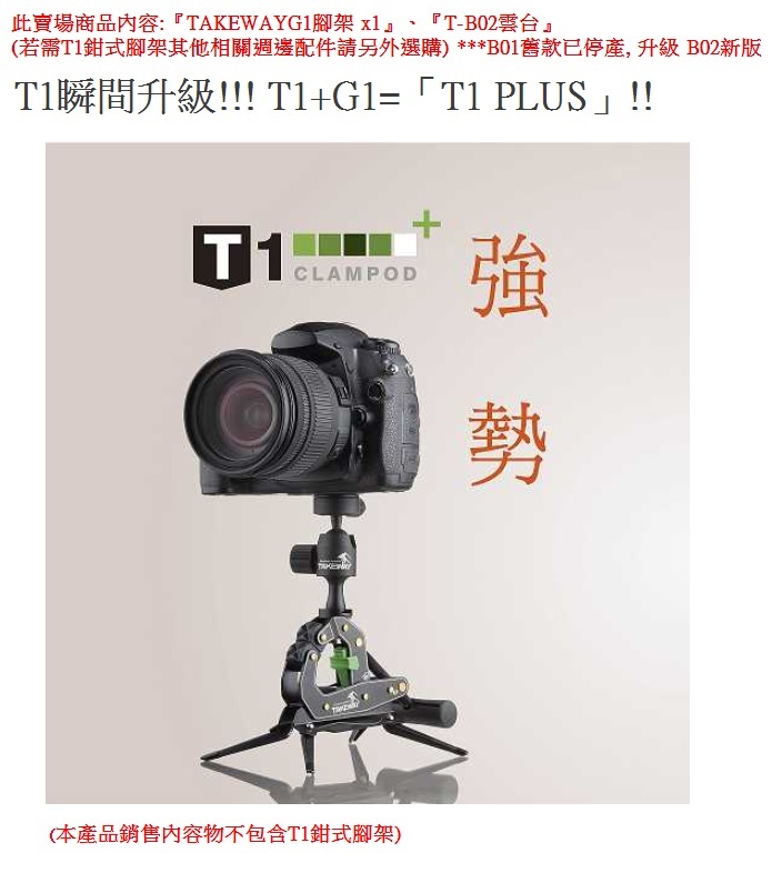 ※ 此賣場商品內容為G1腳架x1、T-B02雲台*1、T-TH01平板座,不包含T1鉗式腳架(請另外選購)、其他相關週邊配件(請另外選購)及相機、手機、平板等相關拍攝道具。