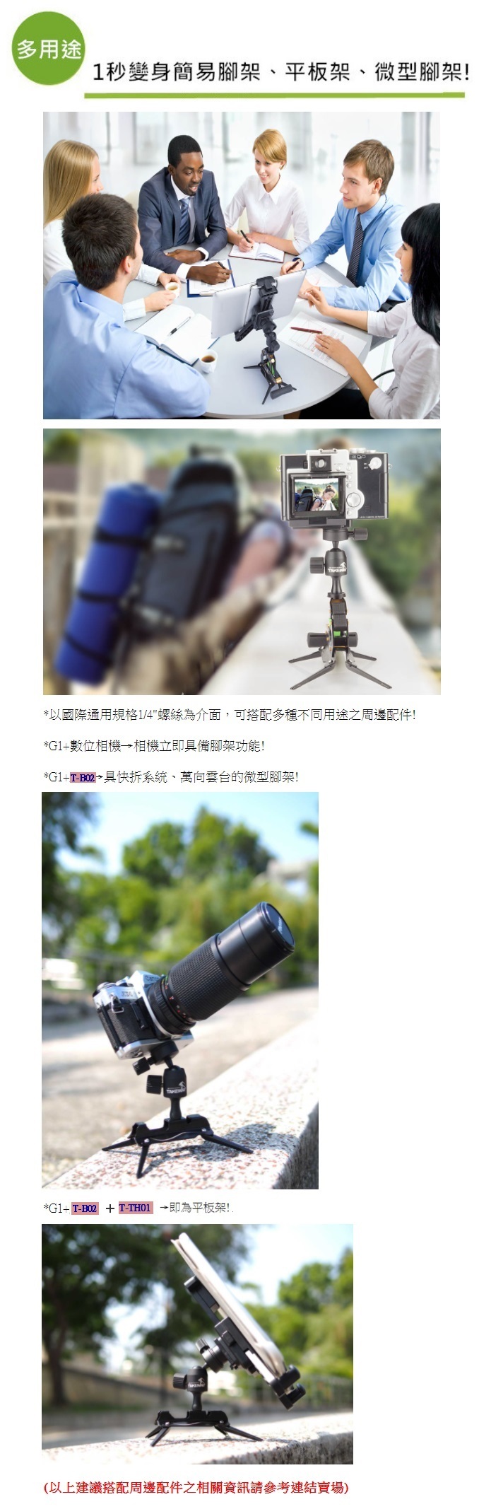多用途!可直接搭配相機使用或T-B02雲台及T-TH01平板座使用!