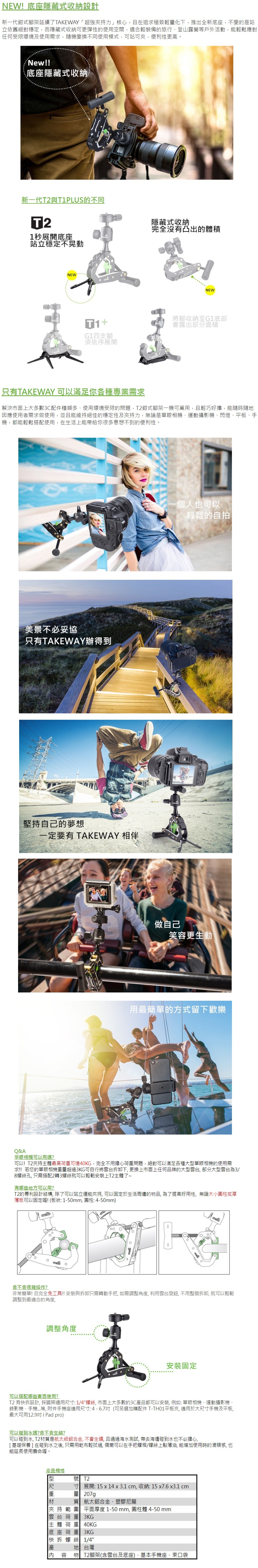 ※此賣場產品內容為T2鉗式腳架x1,不包含介紹內容中其相關零配件 ( 請另外選購 )。
