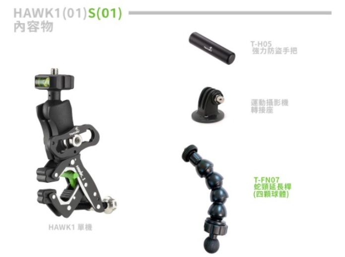 型號: HAWK1(01)S(01) HAWK1極限運動夾*1 (含標配T-H03防盜手把)、運動攝影機轉接座*1、T-AP01 止滑膠墊*1、T-FN07(四顆球體)延長蛇頸*1、強力防盜把手(T-H05) x1