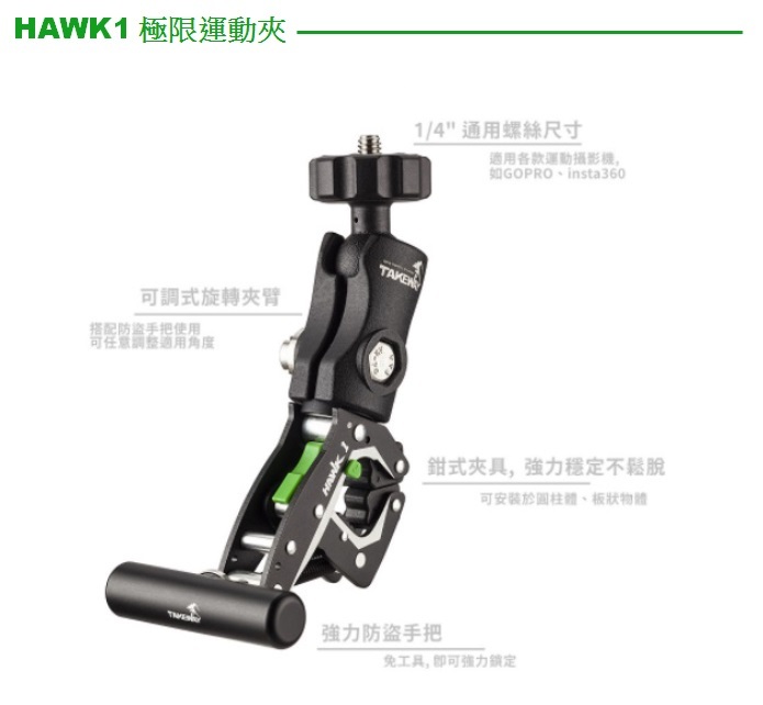 【HAWK1極限用動夾-附強力防盜手把】 通用各款攝影配備,旋轉夾臂的設計,可靈活調整角度,穩定耐震性高,圓柱、板狀皆可固定,搭配強力防盜手把,免工具輕鬆鎖定,拆下立即具有防盜功能。